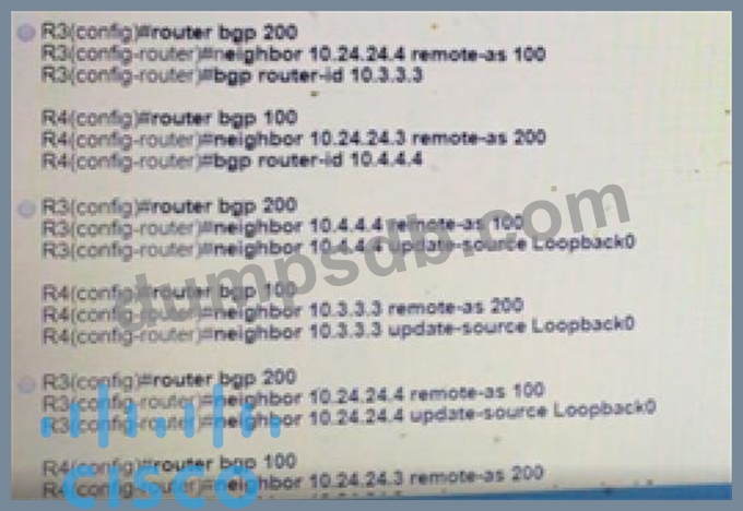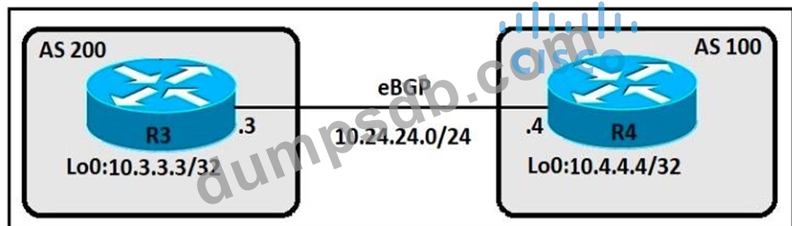 An engineer must establish eBGP peering between router R3 and router R4. Both routers should use their loopback interfaces as the BGP router ID. Which configuration set accomplishes this task?
