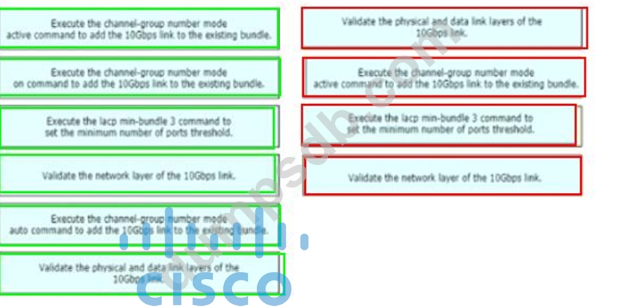 A network engineer is adding an additional 10Gps link to an exiting 2x10Gps LACP-based LAG to augment its capacity. Network standards require a bundle interface to be taken out of service if one of its member links goes down, and the new link must be added with minimal impact to the production network. Drag and drop the tasks that the engineer must perform from the left into the sequence on the right. Not all options are used.