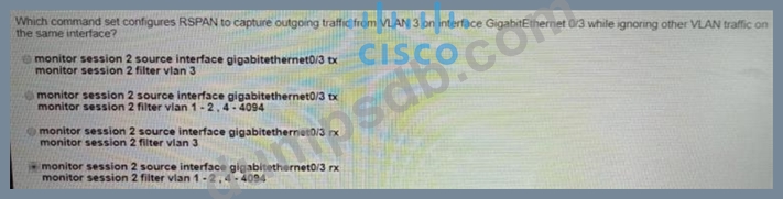 Which command set configures RSPAN to capture outgoing traffic from VLAN 3 on interface GigabitEthernet 0/3 while ignoring other VLAN traffic on the same interface?