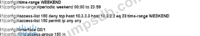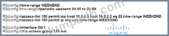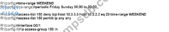An engineer must deny Telnet traffic from the loopback interface of router R3 to the loopback interface of router R2 during the weekend hours. All other traffic between the loopback interfaces of routers R3 and R2 must be allowed at all times. Which command accomplish this task?