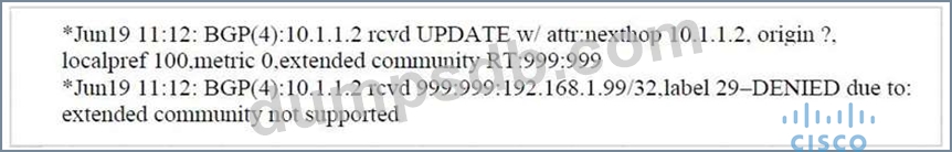 ip bgp vpnv4 unicast updates on PE1, and you can see the route in the debug, but not in the BGP VPNv4 table. Which two statements are true? (Choose two)