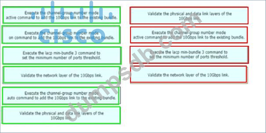A network engineer is adding an additional 10Gps link to an exiting 2x10Gps LACP-based LAG to augment its capacity. Network standards require a bundle interface to be taken out of service if one of its member links goes down, and the new link must be added with minimal impact to the production network. Drag and drop the tasks that the engineer must perform from the left into the sequence on the right. Not all options are used.