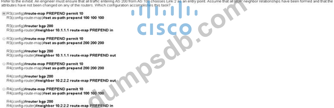 Refer to the exhibit. An engineer must ensure that all traffic entering AS 200 form AS 100 chooses link 2 an enter all BGP neighbor relationship have been formed and that attributes have not been changed on any of the router.