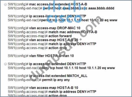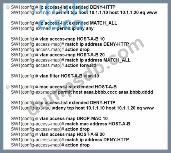 An engineer must deny HTTP traffic from host A to host B while allowing all other communication between the hosts. Which command set accomplishes this task?