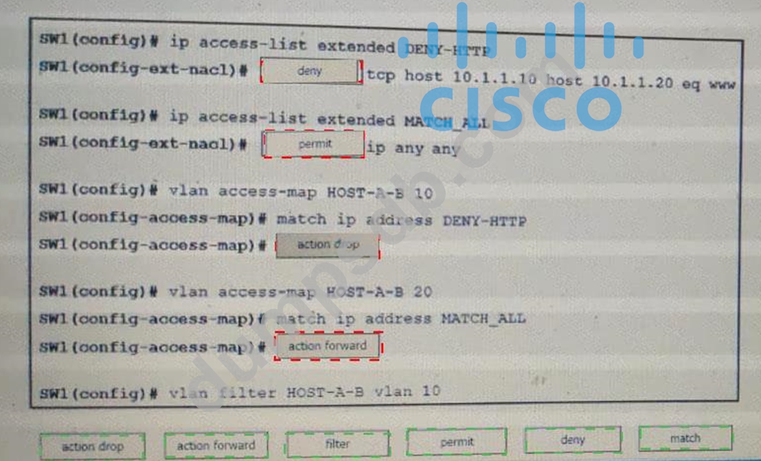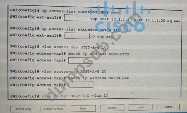 An engineer must deny HTTP traffic from host A to host B while allowing all other communication between the hosts, drag and drop the commands into the configuration to achieve these results. Some commands may be used more than once. Not all commands are used.