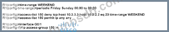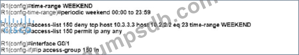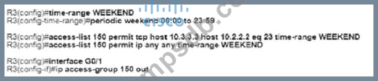 An engineer must deny Telnet traffic from the loopback interface of router R3 to the loopback interface of router R2 during the weekend hours. All other traffic between the loopback interfaces of routers R3 and R2 must be allowed at all times. Which command accomplish this task?