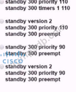 An engineer must configure HSRP group 300 on a Cisco IOS router. When the router is functional, it must be the must be the active HSRP router. The peer router has been configured using the default priority value.