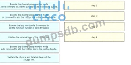 A network engineer is adding an additional 10Gps link to an exiting 2x10Gps LACP-based LAG to augment its capacity. Network standards require a bundle interface to be taken out of service if one of its member links goes down, and the new link must be added with minimal impact to the production network. Drag and drop the tasks that the engineer must perform from the left into the sequence on the right. Not all options are used.