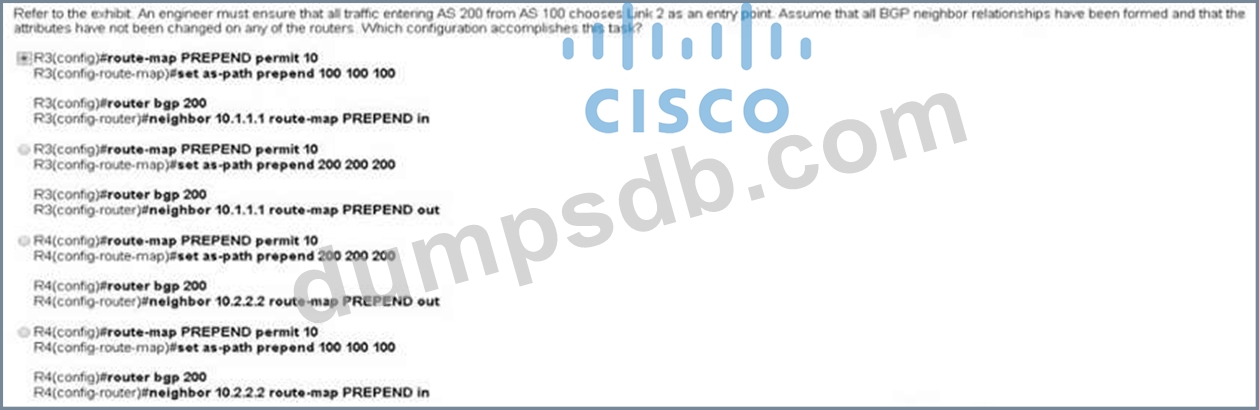 Refer to the exhibit. An engineer must ensure that all traffic entering AS 200 form AS 100 chooses link 2 an enter all BGP neighbor relationship have been formed and that attributes have not been changed on any of the router.
