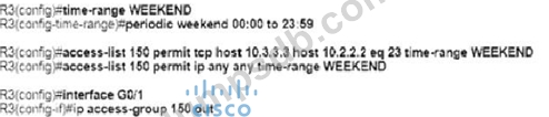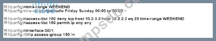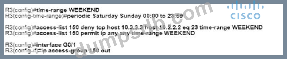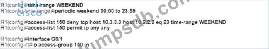 An engineer must deny Telnet traffic from the loopback interface of router R3 to the loopback interface of router R2 during the weekend hours. All other traffic between the loopback interfaces of routers R3 and R2 must be allowed at all times. Which command accomplish this task?