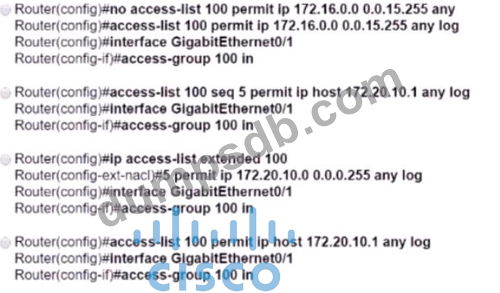 Which command set must be added to permit and log all traffic that comes from 172.20.10.1 in interface GigabitEthernet0/1 without impacting the functionality of the access list?