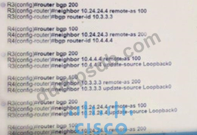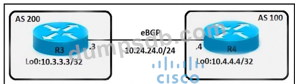 An engineer must establish eBGP peering between router R3 and router R4. Both routers should use their loopback interfaces as the BGP router ID. Which configuration set accomplishes this task?