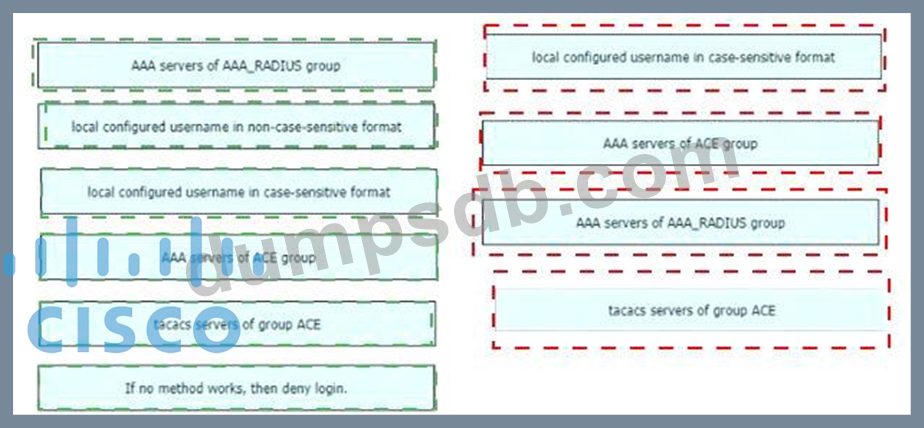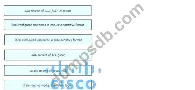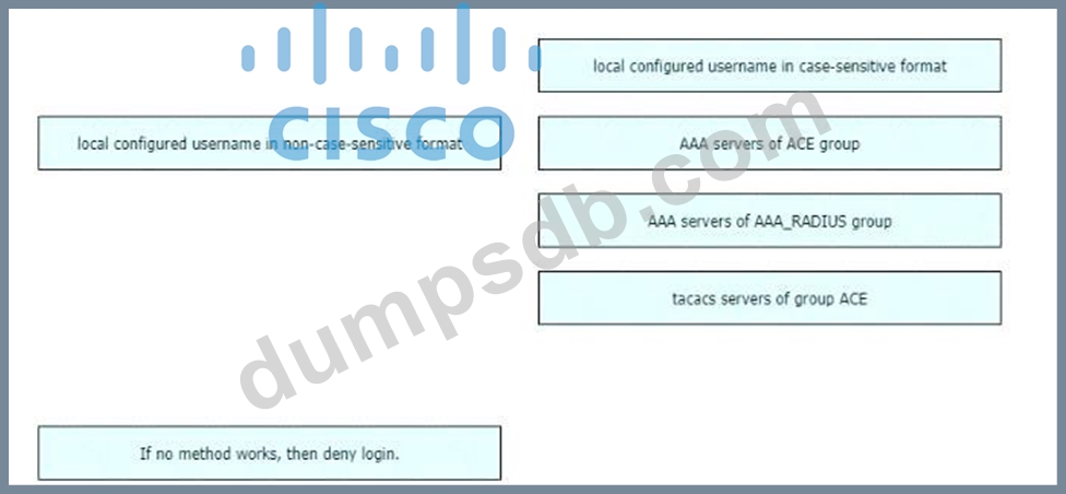 An engineer creates the configuration below. Drag and drop the authentication methods from the left into the order of priority on the right. Not all options are used.