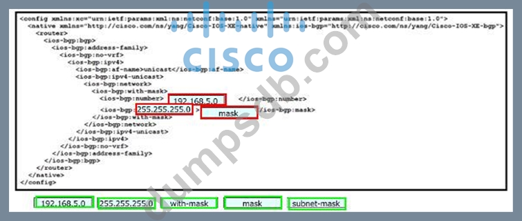 Drag and drop the snippets onto the blanks within the code to construct a script that advertises the network prefix 192.168.5.0/24 into a BGP session. Not all options are used
