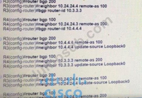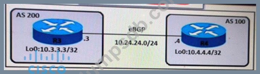 An engineer must establish eBGP peering between router R3 and router R4. Both routers should use their loopback interfaces as the BGP router ID. Which configuration set accomplishes this task?