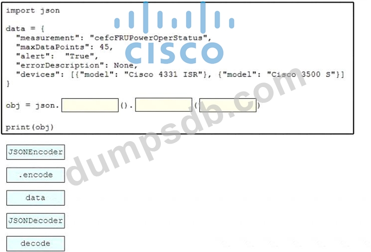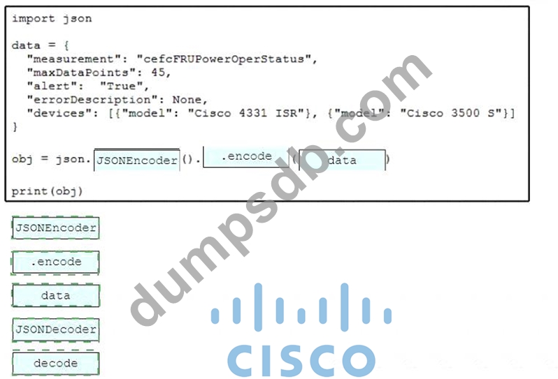 Drag and drop the code snippets from the bottom onto the blanks in the script to convert a Python object into a JSON string. Not all options are used.
