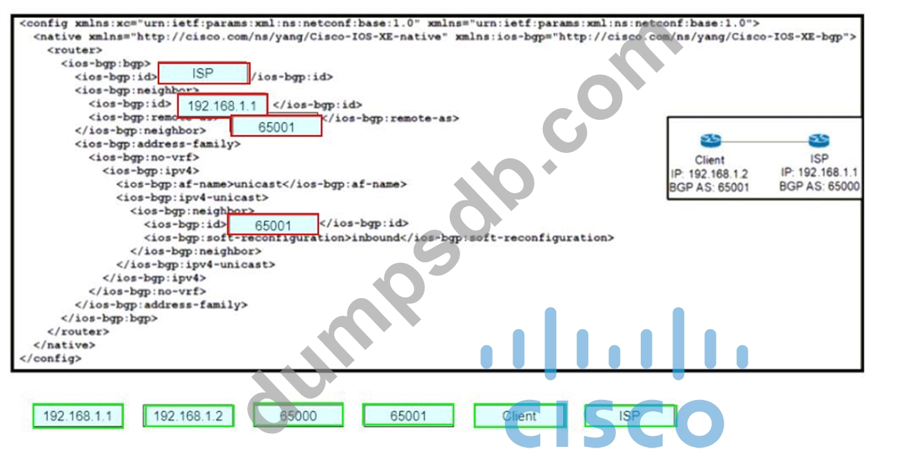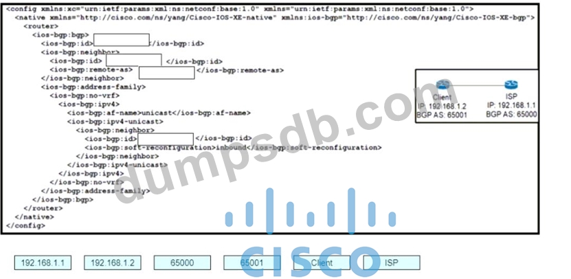 Drag and drop the snippets onto the blanks within the code to construct a script that configures BGP according to the topology. Not all options are used, and some options may be used twice.