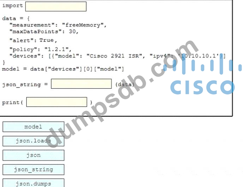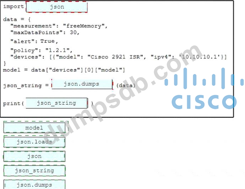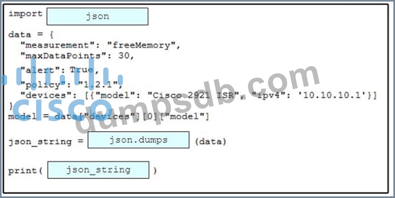 Drag and drop the code snippets from the bottom onto the blanks in the Python script to convert a Python object into a JSON string. Not all options are used.