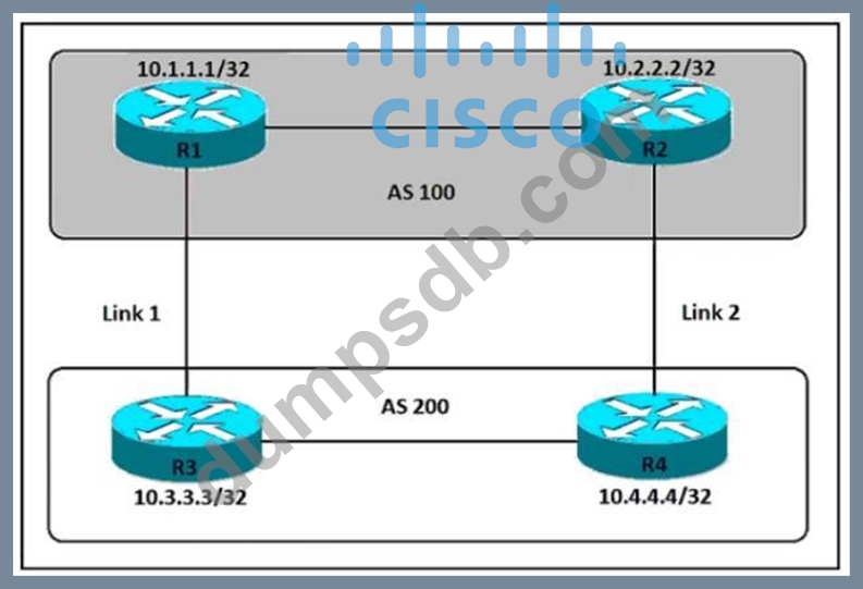 An engineer must ensure that all traffic leaving AS 200 will choose Link 2 as the exit point. Assuming that all BGP neighbor relationships have been formed and that the attributes have not been changed on any of the routers, which configuration accomplish task?