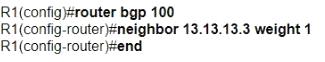 An engineers reaching network 172 16 10 0/24 via the R1-R2-R4 path. Which configuration forces the traffic to take a path of R1-R3-R4?