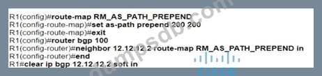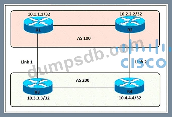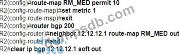 An engineer must ensure that all traffic leaving AS 200 will choose Link 2 as the exit point. Assuming that all BGP neighbor relationships have been formed and that the attributes have not been changed on any of the routers, which configuration accomplish task?