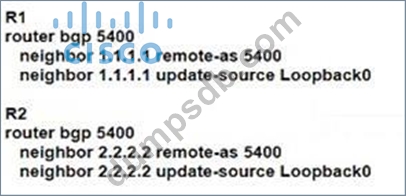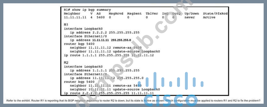 Router R1 is reporting that its BGP neighbor adjacency to router R2 is down, but its state is Active as shown.