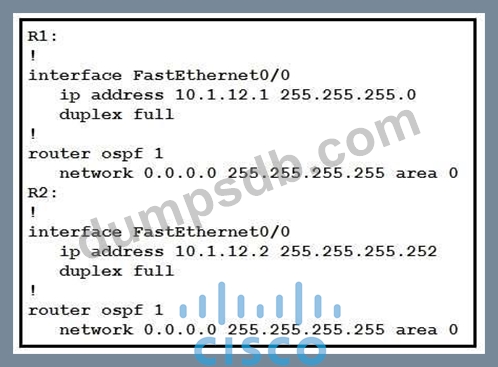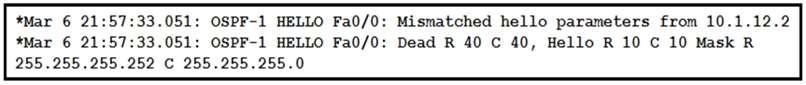 Refer to the exhibit. R1 and R2 are directly connected with Fast Ethernet interfaces and have the above configuration applied OSPF adjacency is not formed. When the debug ip ospf hello command is issued on R1, these log messages are seen: