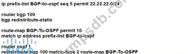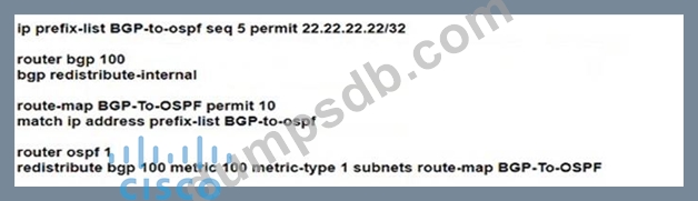 Router 1 and router 2 are running BGP. and router 2 and router 3 are running OSPF Area 0. Router 1 is advertising loopback interlaces Lo 0 and lo 2. and router 2 is redistributing BGP into OSPF Area 0. Which configuration must an administrator apply so that router 2 uses a route map to redistribute only the internal route from Lo 2?