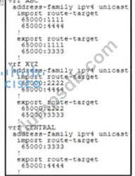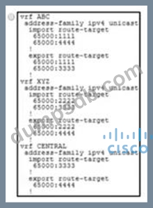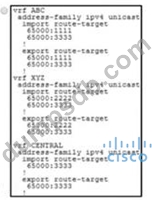 An engineer is setting up overlapping VPNs to allow VRF ABC and XYZ to communicate with VRF CENTRAL but wants to make sure that VRF ABC and XYZ cannot communicate. Which configuration accomplishes these objectives?