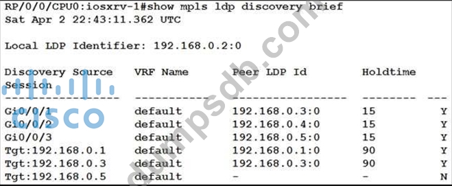 Refer to the exhibit. With which router does IOSXRV-1 have LDP session protection capability enabled but session hold up is not active?