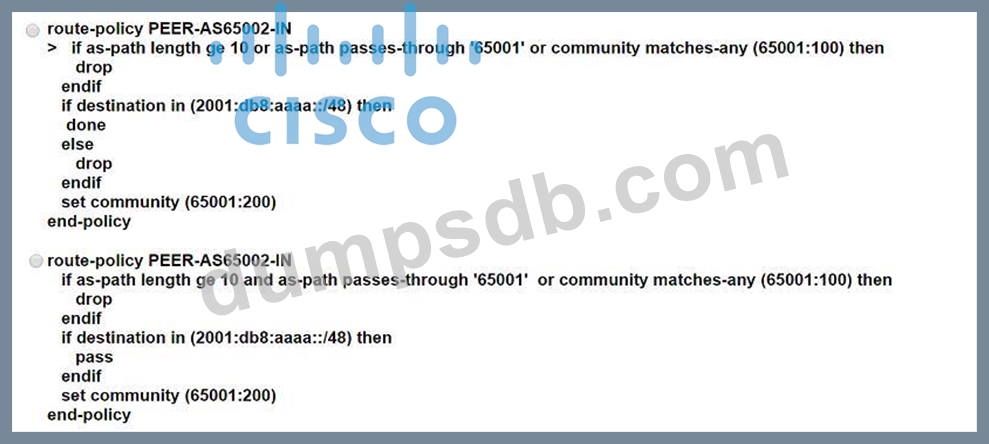 :db8:aaaa::/48. An engineer needs to update the ASN 65001 route-filtering configuration to meet these conditions: