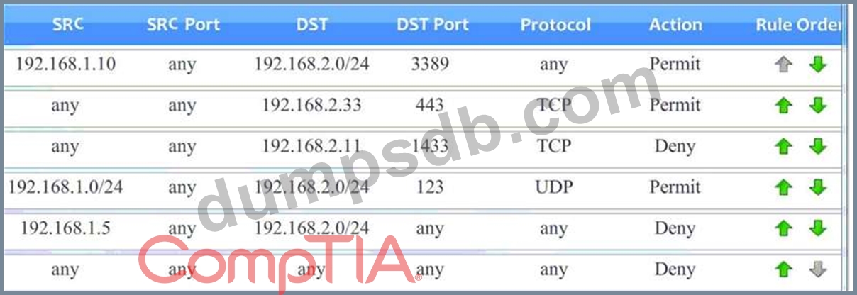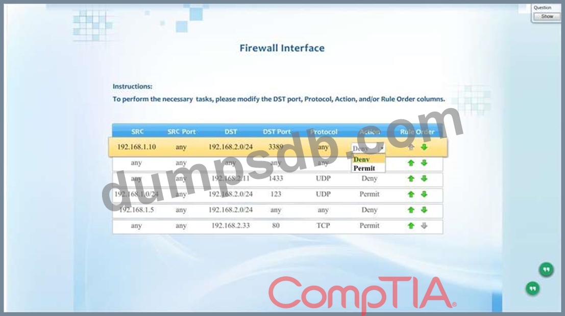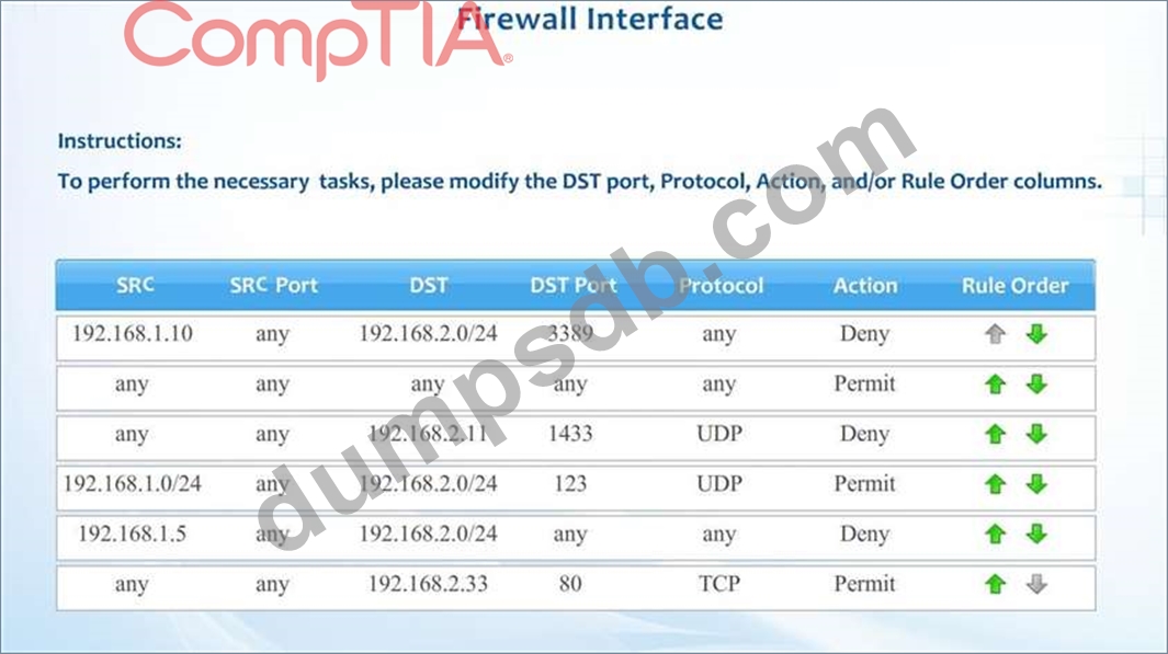 Instructions: To perform the necessary tasks, please modify the DST port, Protocol, Action, and/or Rule Order columns. Firewall ACLs are read from the top down Task 1) An administrator added a rule to allow their machine terminal server access to the server subnet. This rule is not working. Identify the rule and correct this issue.