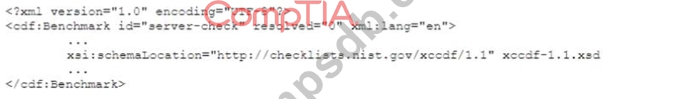 An engineer wants to assess the OS security configurations on a company's servers. The engineer has downloaded some files to orchestrate configuration checks When the engineer opens a file in a text editor, the following excerpt appears: