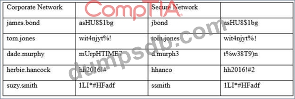An information security officer is responsible for one secure network and one office network. Recent intelligence suggests there is an opportunity for attackers to gain access to the secure network due to similar login credentials across networks. To determine the users who should change their information, the information security officer uses a tool to scan a file with hashed values on both networks and receives the following data: