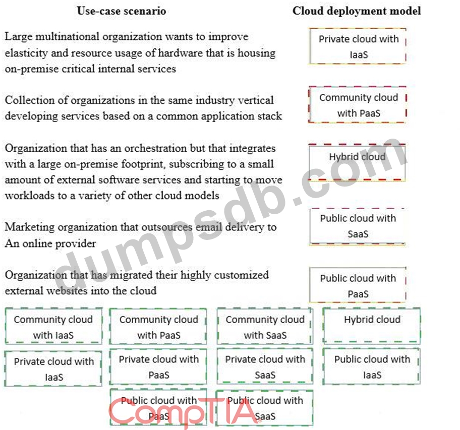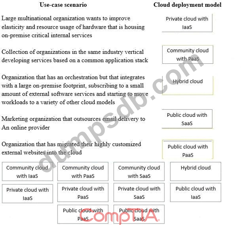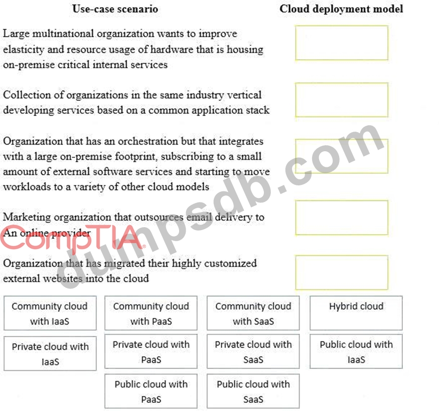 Drag and drop the cloud deployment model to the associated use-case scenario. Options may be used only once or not at all.