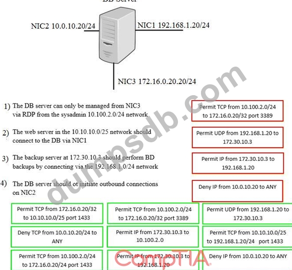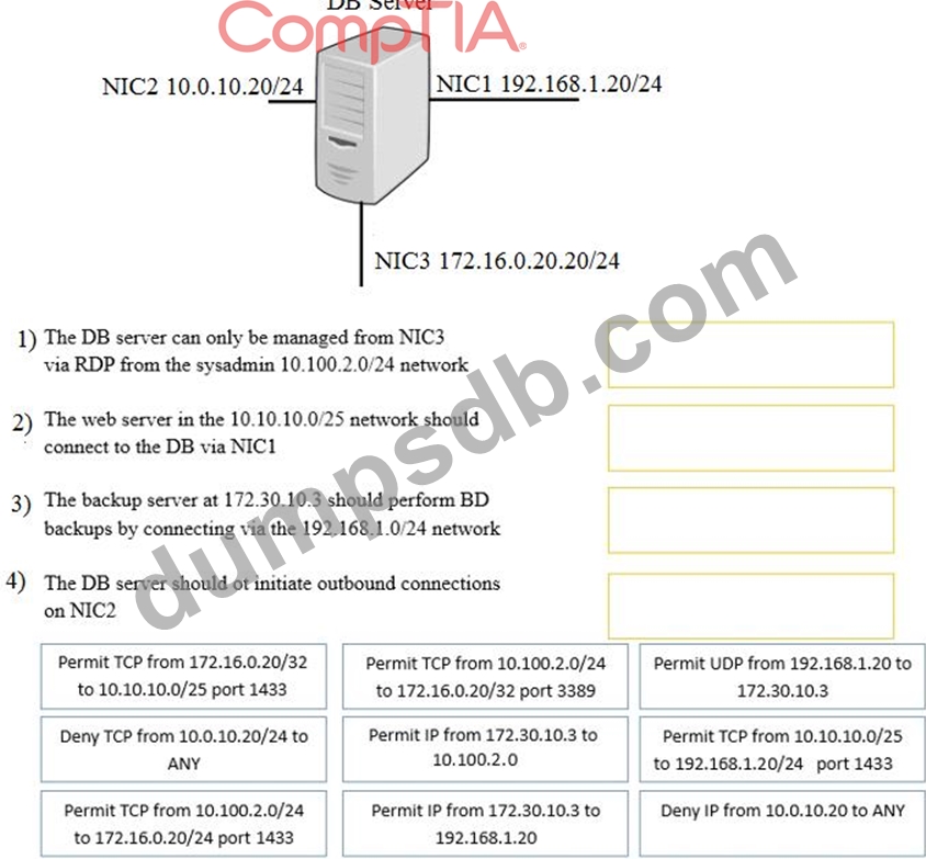 A security administrator must configure the database server shown below to comply with the four requirements listed. Drag and drop the appropriate ACL that should be configured on the database server to its corresponding requirement. Answer options may be used once or not at all.