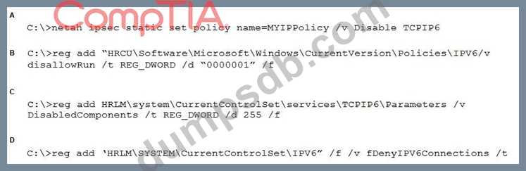 A security analyst, who is working in a Windows environment, has noticed a significant amount of IPv6 traffic originating from a client, even though IPv6 is not currently in use. The client is a stand-alone device, not connected to the AD that manages a series of SCADA devices used for manufacturing. Which of the following is the appropriate command to disable the client's IPv6 stack?