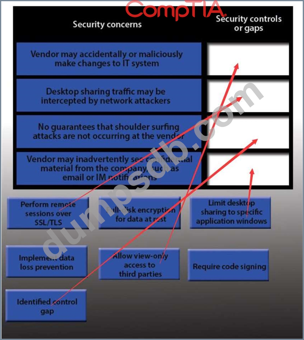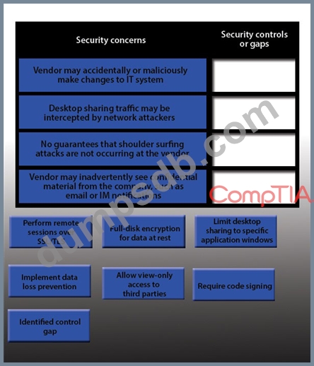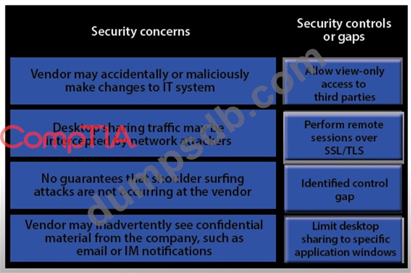 IT staff within a company often conduct remote desktop sharing sessions with vendors to troubleshoot vendor product-related issues. Drag and drop the following security controls to match the associated security concern.
