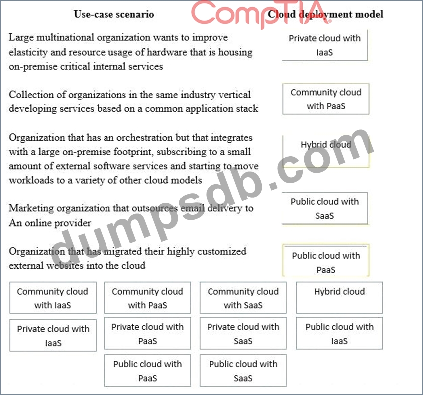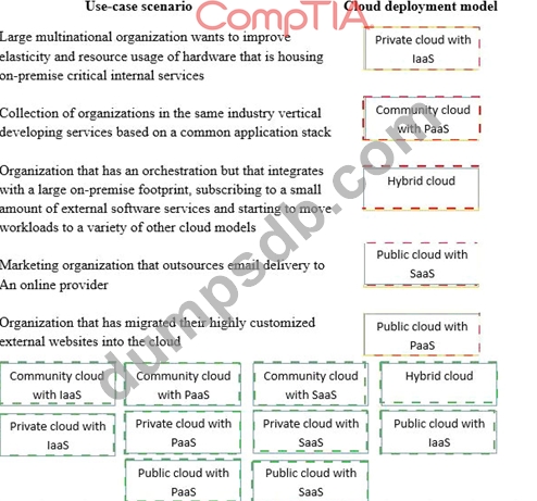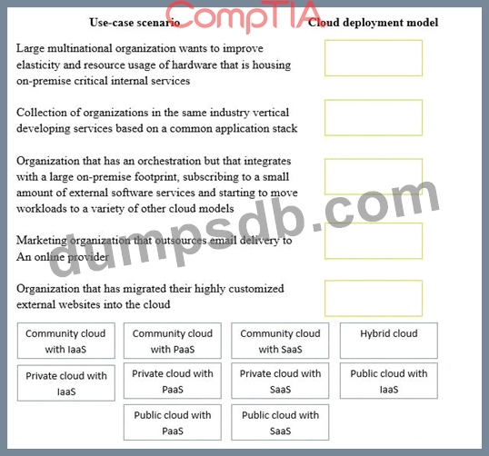 Drag and drop the cloud deployment model to the associated use-case scenario. Options may be used only once or not at all.