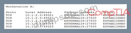 A newly discovered malware has a known behavior of connecting outbound to an external destination on port 27500 for the purposes of exfiltrating data. The following are four snippets taken from running netstat -anon separate Windows workstations: