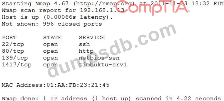 An organization is conducting penetration testing to identify possible network vulnerabilities. The penetration tester has received the following output from the latest scan: