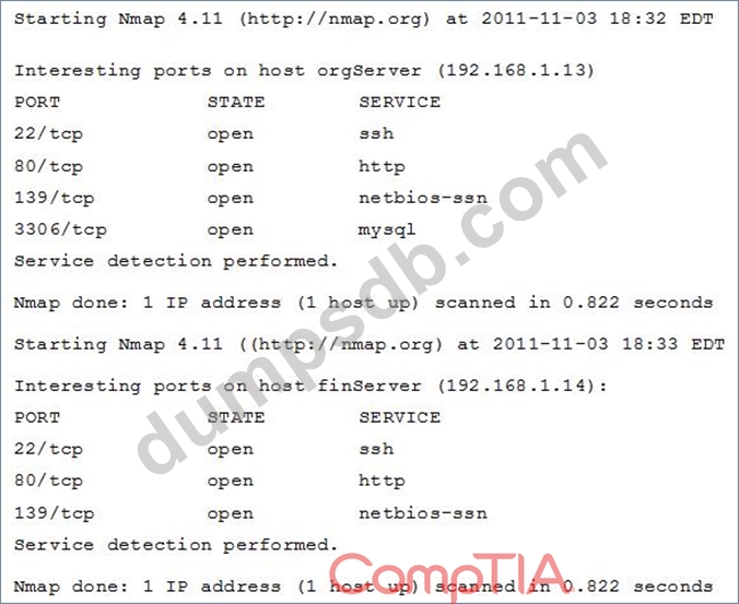 An organization has been conducting penetration testing to identify possible network vulnerabilities. One of the security policies states that web servers and database servers must not be co-located on the same server unless one of them runs on a non-standard. The penetration tester has received the following outputs from the latest set of scans: