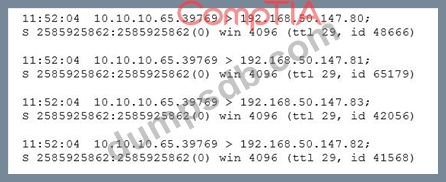 After running a packet analyzer on the network, a security analyst has noticed the following output: