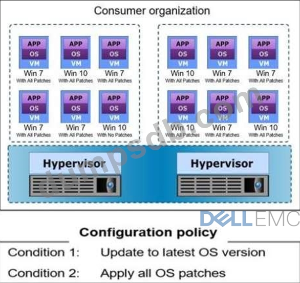 For compliance reasons, the cloud service provider maintains version control over the OS provided to the consumer. The service provider also ensures that the configurations of the VMs comply with the configuration policy for the OS version. The configuration policy includes the two conditions shown in the exhibit. A monitoring tool verifies VM configurations against the configuration policy and provides the compliance results shown.
