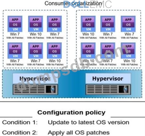 For compliance reasons, the cloud service provider maintains version control over the OS provided to the consumer. The service provider also ensures that the configurations of the VMs comply with the configuration policy for the OS version. The configuration policy includes the two conditions shown in the exhibit. A monitoring tool verifies VM configurations against the configuration policy and provides the compliance results shown.