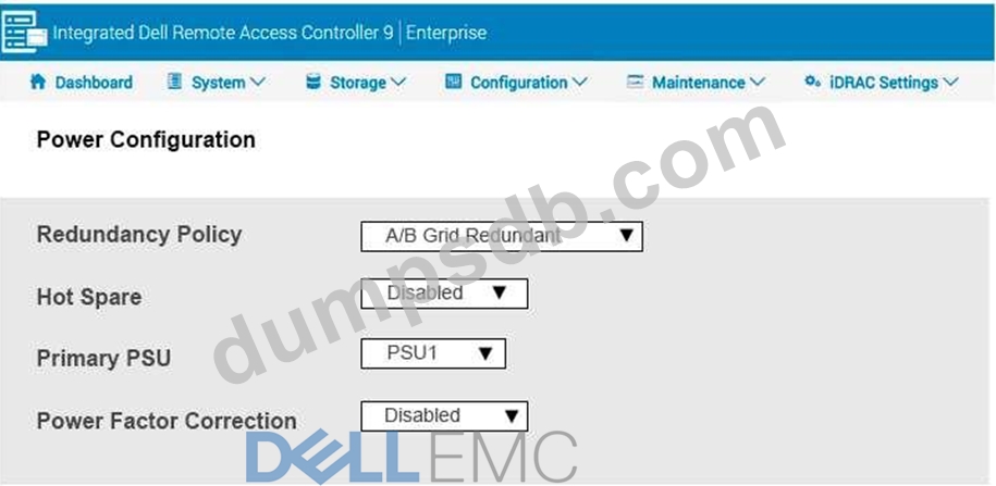 Based on the exhibit, Grid Redundant Mode is selected on a Dell EMC PowerEdge server and the Hot Spare feature is disabled. How is the power output distributed in a dual-power supply configuration?