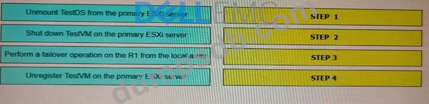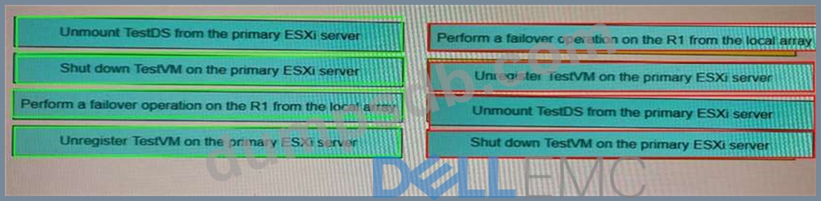 A non-production environment has been created with a VMFS Datastore named TestDS and a virtual machine named TestVM. SRDF/S has been configured between two PowerMax arrays One ESXi server is connected to the R1 device and another is connected to the R2 device. The VMFS Datastore resides on the R1 device. The systems administrator wants to test the environment for disaster recovery readiness To simulate a disaster on the R1 side a graceful failover will be done. What is the correct sequence of steps on the R1 side of the test environment to perform a graceful failover?