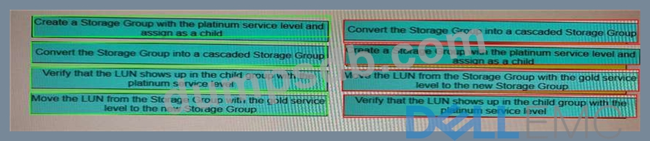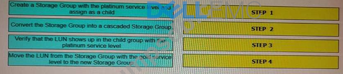 A host has LUNs assigned through a Masking View containing one regular Storage Group The Storage Group has the gold service level assigned One LUN requires a higher service level What is the correct sequence of steps required to assign the platinum service level to that LUN?