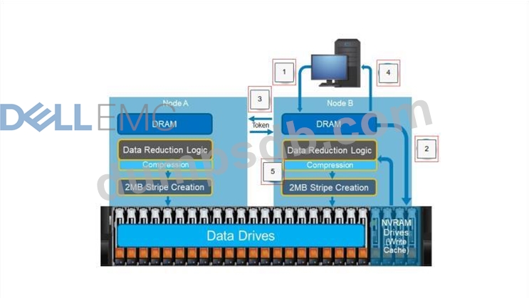 between the Nodes using tokens. This operation updates the peer node that a new write has been received and that it has the newest copy of the data. A token includes information about the I/O such as what resource was updated and the address within the resource that was updated. A token also includes information Data Efficiency about the location the I/O was saved to within the write cache. If the peer Node requests that information, the Node can access the data within the NVRAM drives using its own internal channels.