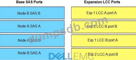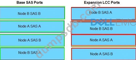 When connecting a PowerStore base enclosure to 2 expansion enclosures, match the base SAS ports in column A to their corresponding expansion LCC ports in column B.